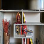 Kitaplık olarak tasarlanan modern tv ünitesinde, küçük boyutlarda vazo ve biblo ürünler kullanabilirsiniz.